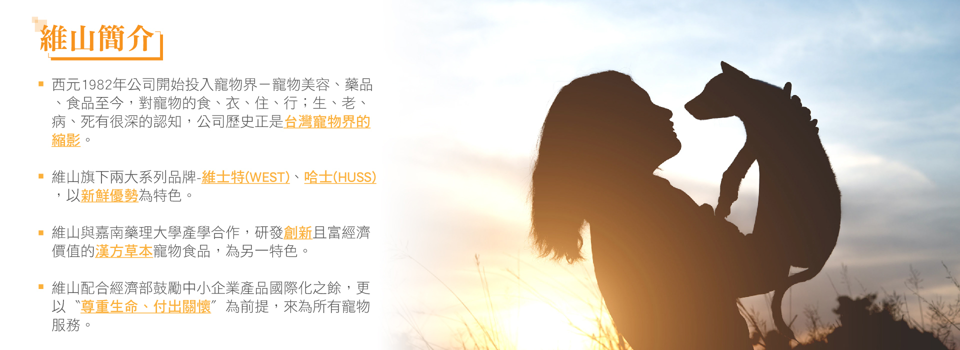 西元1982年公司成立,開始投入寵物界-寵物美容、動物用藥品、寵物食品至今,對寵物的食衣住行生老病死,有很深刻的認知,維山歷史正是台灣寵物界的縮影。維山旗下兩大寵物食品系列-維士特WEST、哈士HUSS,以新鮮優勢為特色,並與嘉南藥理大學產學合作,研發創新且具經濟價值的漢方草本寵物食品(飼料),為另一特色。維山配合經濟部鼓勵中小企業國際化之餘,更以尊重生命付出關懷為前提,願為所有寵物生命代言。
