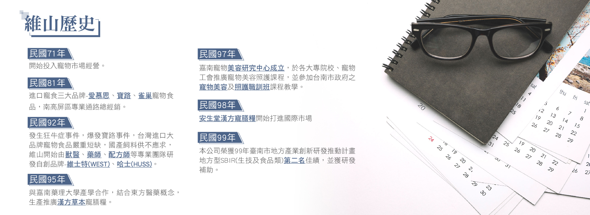 民國95年 維山與嘉南藥理大學產學合作,結合東方醫藥概念,創新生產推廣漢方草本寵物飼料。