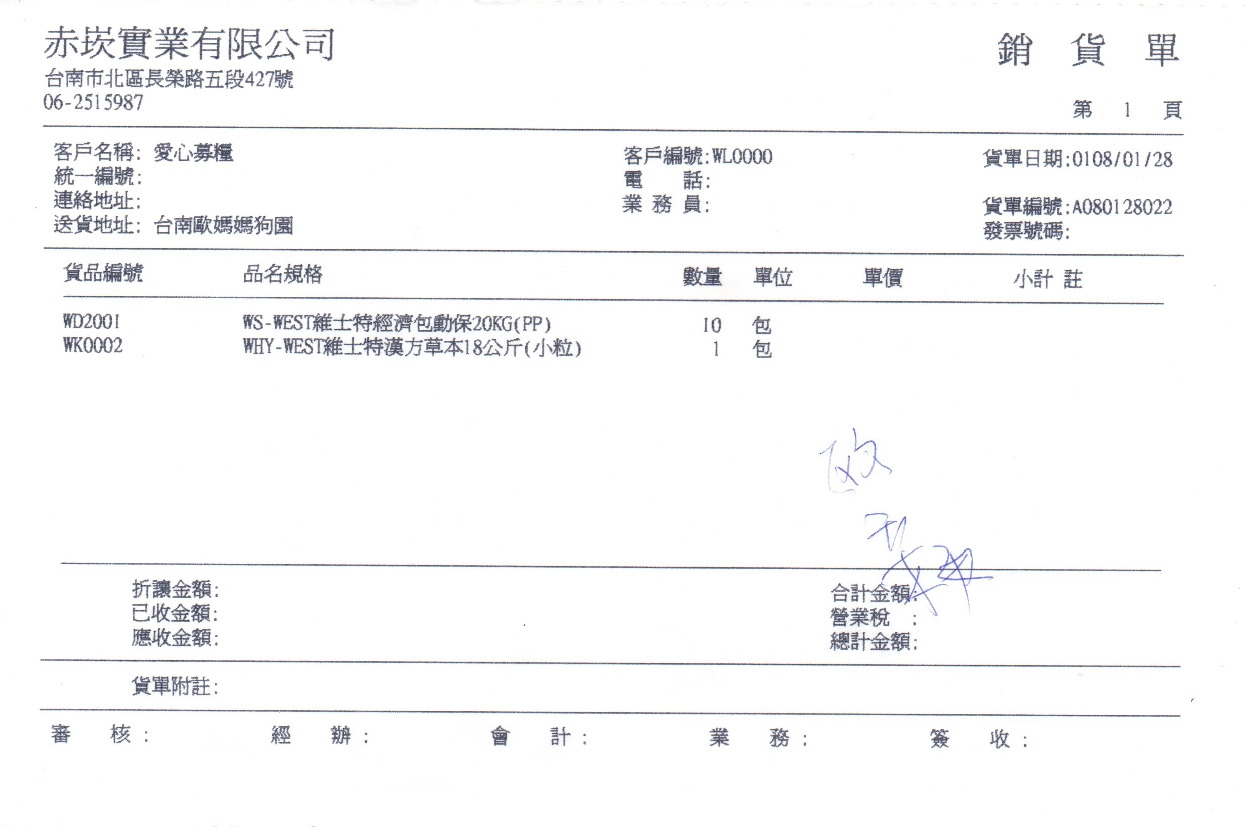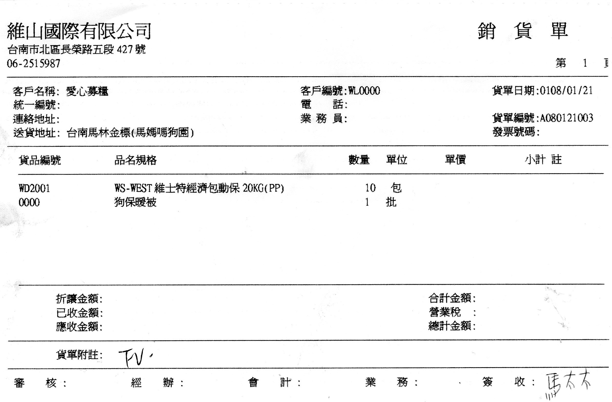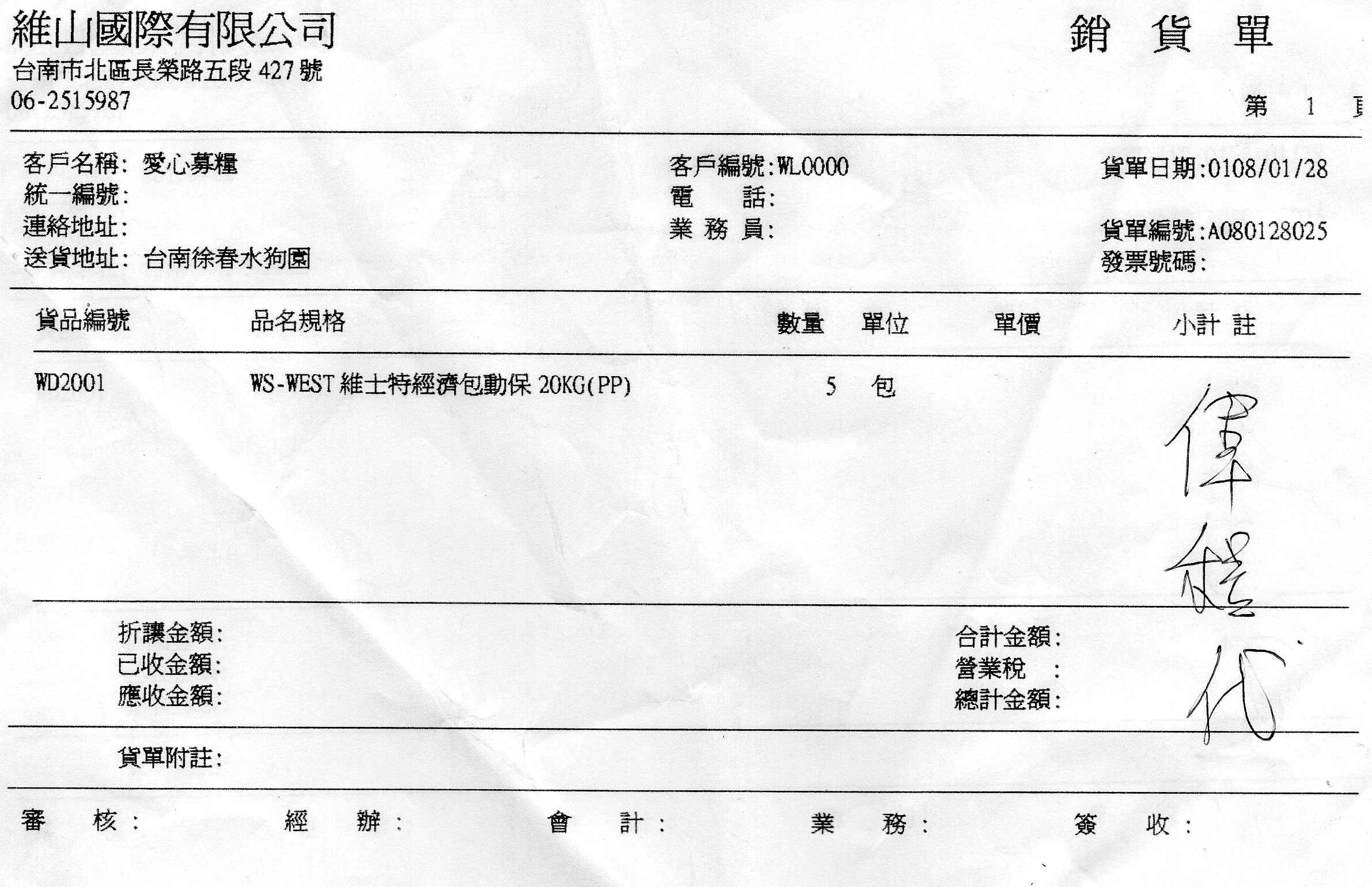 愛心媽媽狗園,至108/1/28為止完成九成出貨,剩花媽狗園延至過年後出貨。各位愛媽的收貨簽單照片如下: