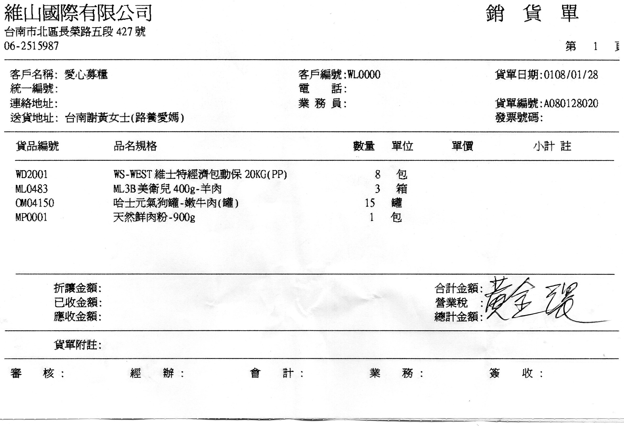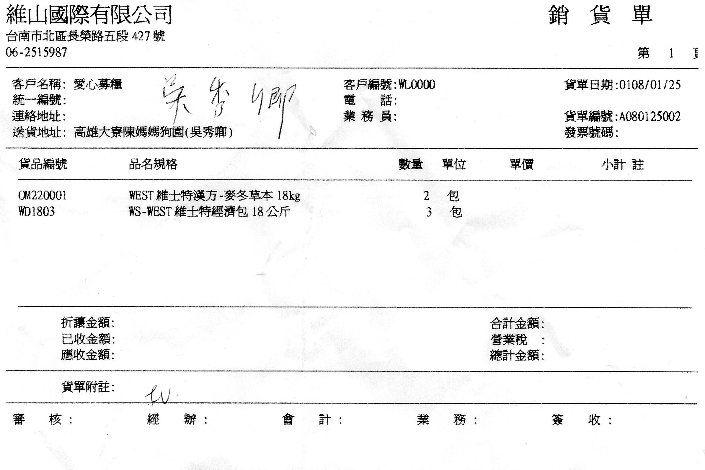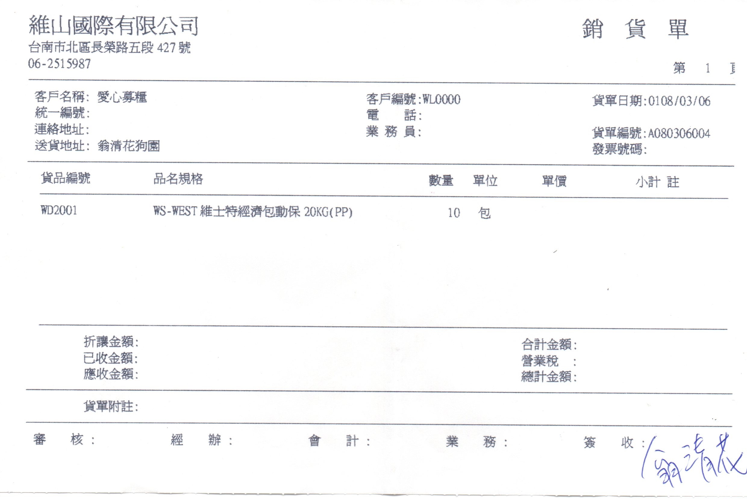 愛心媽媽狗園,至108/1/28為止完成九成出貨,剩花媽狗園延至過年後出貨。各位愛媽的收貨簽單照片如下: