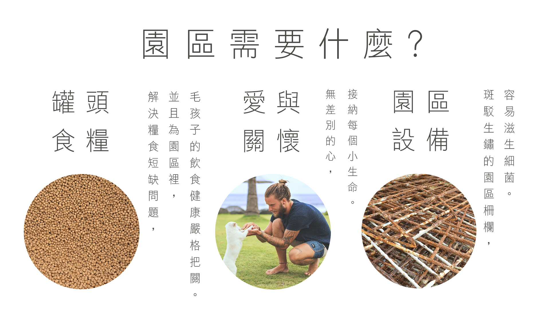 一條命兩樣情,極為類似在台灣的毛孩(寵物)與浪孩(流浪動物),雖然我們沒有能力消彌人類的貧富差距,但我們有能力給浪孩最"食"惠的幫助。維士特、可貝兒狗飼料及哈士澳洲製造犬罐頭。捐糧到園區給流浪犬一個溫飽,讓愛散佈到每一個角落。