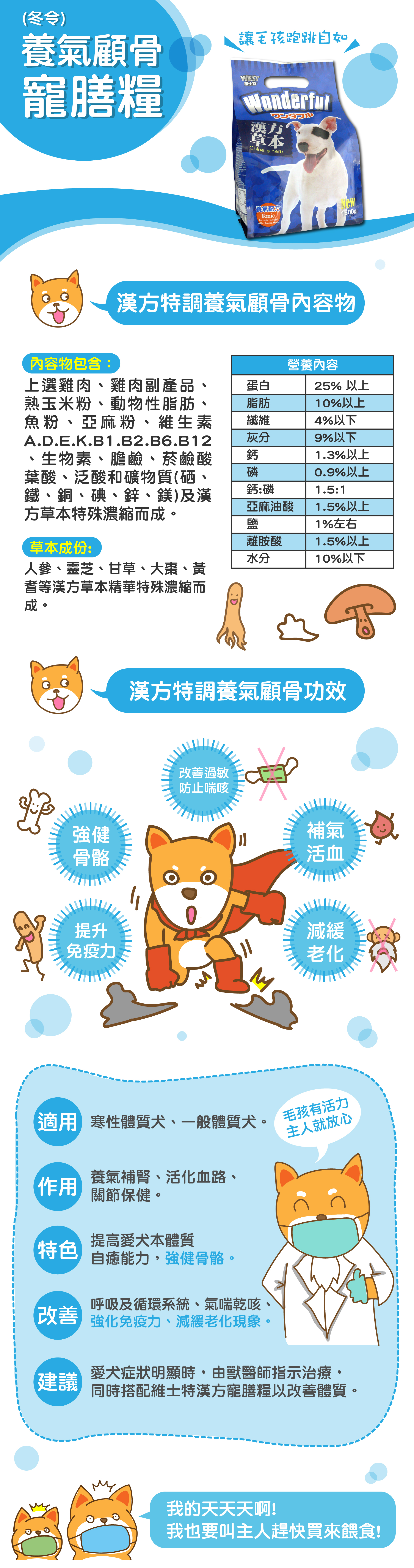 一包真正養氣補體糧! 搭配傳統24節氣,漢方中藥特調而成的維士特補氣顧骨抗喘配方狗飼料,增強免疫力,狗狗有氣力,改善老狗常見的呼吸道過敏炎症,狗不喘,人心安。漢方補氣顧骨配方,是為寒性體質居家老毛孩的最佳補品!